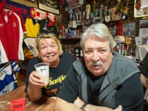 C’est sans doute comme cela que Michel aurait souhaité que nous lui rendions hommage, en profitant une dernière fois du Rouge et Noir, ce petit temple du rugby toulousain qui avait tout d’un musée ou plutôt d’une caverne à souvenirs, ceux de Michel et Huguette, accumulés en trente années au fil des rencontres et des visites de supporters de tous horizons. Devenus deux figures incontournables du quartier Saint-Cyprien, ils partageaient une passion commune, celle du Stade Toulousain, Huguette en tant que présidente actuelle du club de supporters « Le Rouge et Noir », et Michel aux manettes du bar du même nom.